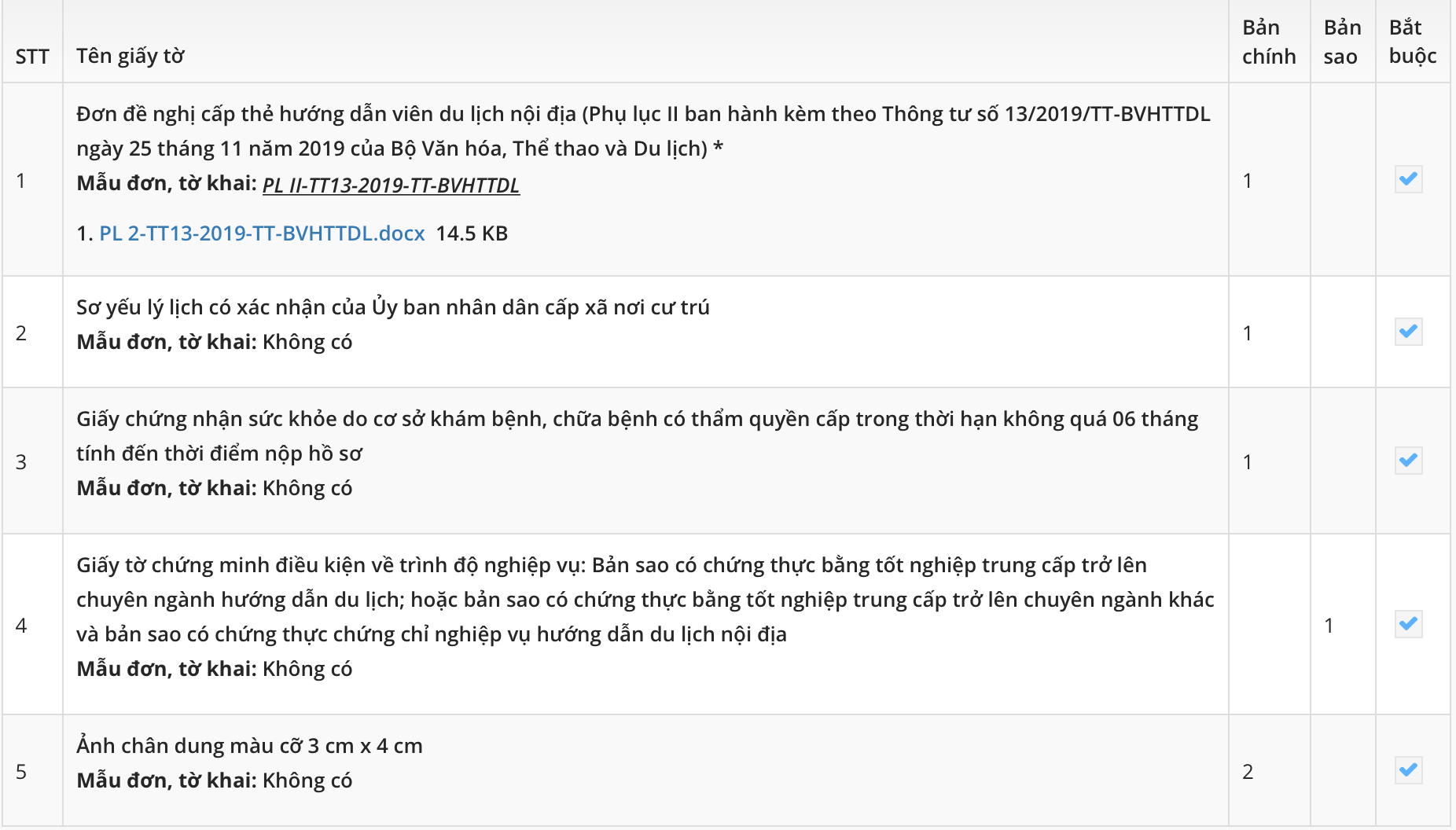- Bản sao bằng trung cấp trở lên chuyên ngành hướng dẫn du lịch HOẶC bản sao bằng trung cấp trở lên ngành bất kỳ VÀ chứng chỉ nghiệp vụ hướng dẫn du lịch .