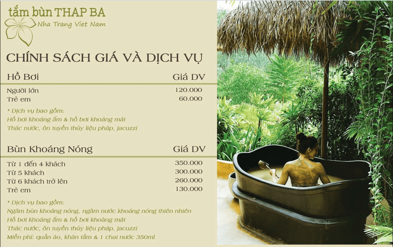– Bùn khoáng nóng với chất lượng cao, bùn đặc, đảm bảo độ ấm. – Doanh nghiệp đi đầu về cung cấp dịch vụ Tắm Bùn Nha Trang, chất lượng ổn định – Dịch vụ đa dạng, trải đều ở các phân khúc khách hàng khác nhau