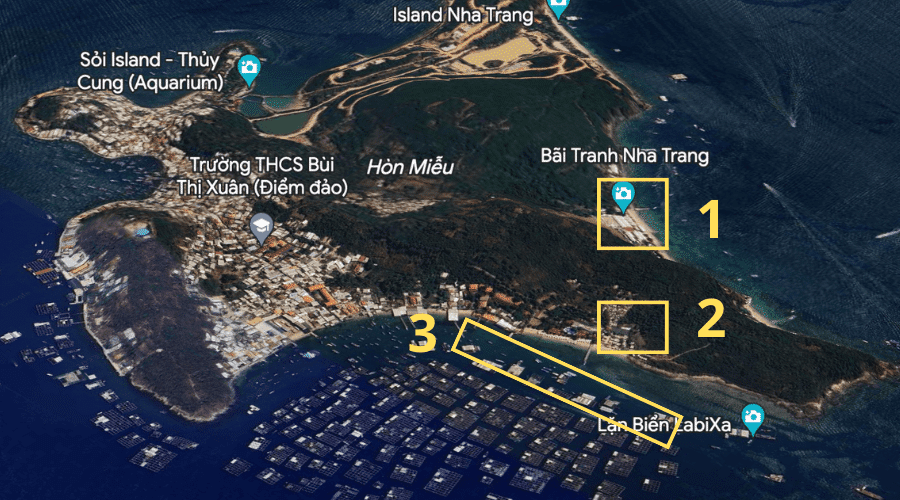 Ở tour này, tham quan các điểm Bãi Tranh – Làng Chài – Vịnh San Hô 2. Trên thực tế đây là 3 điểm tham quan nằm chung trong khu vực đảo Hòn Miễu. Mặc dù với tên gọi có số “3”, nhưng thực tế chỉ là 1 thôi. Mời bạn nhìn vào ảnh vệ tinh dưới đây để dễ hình dung.